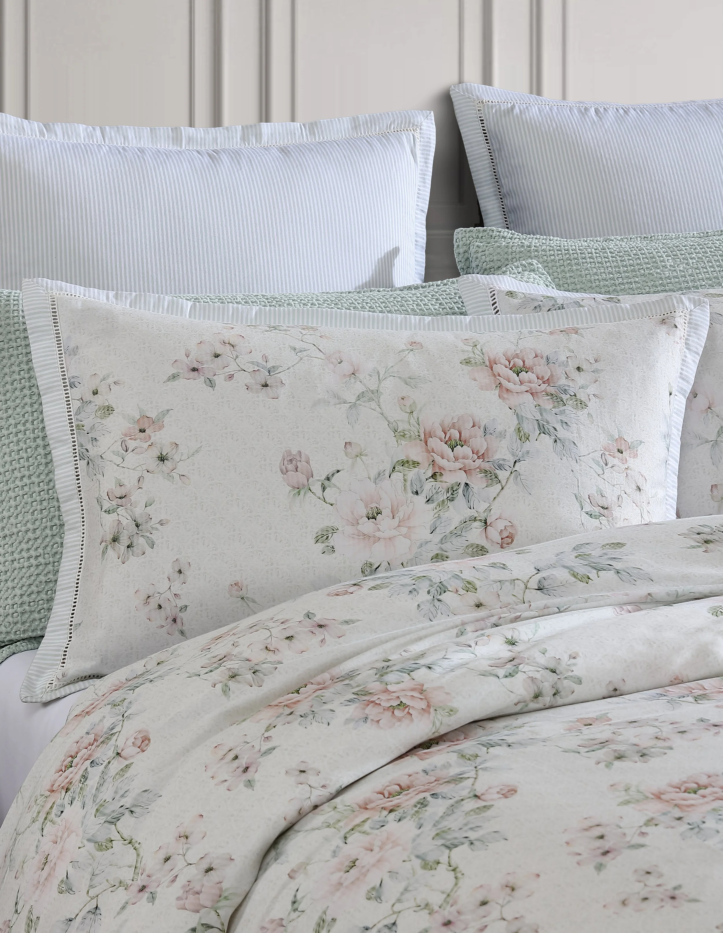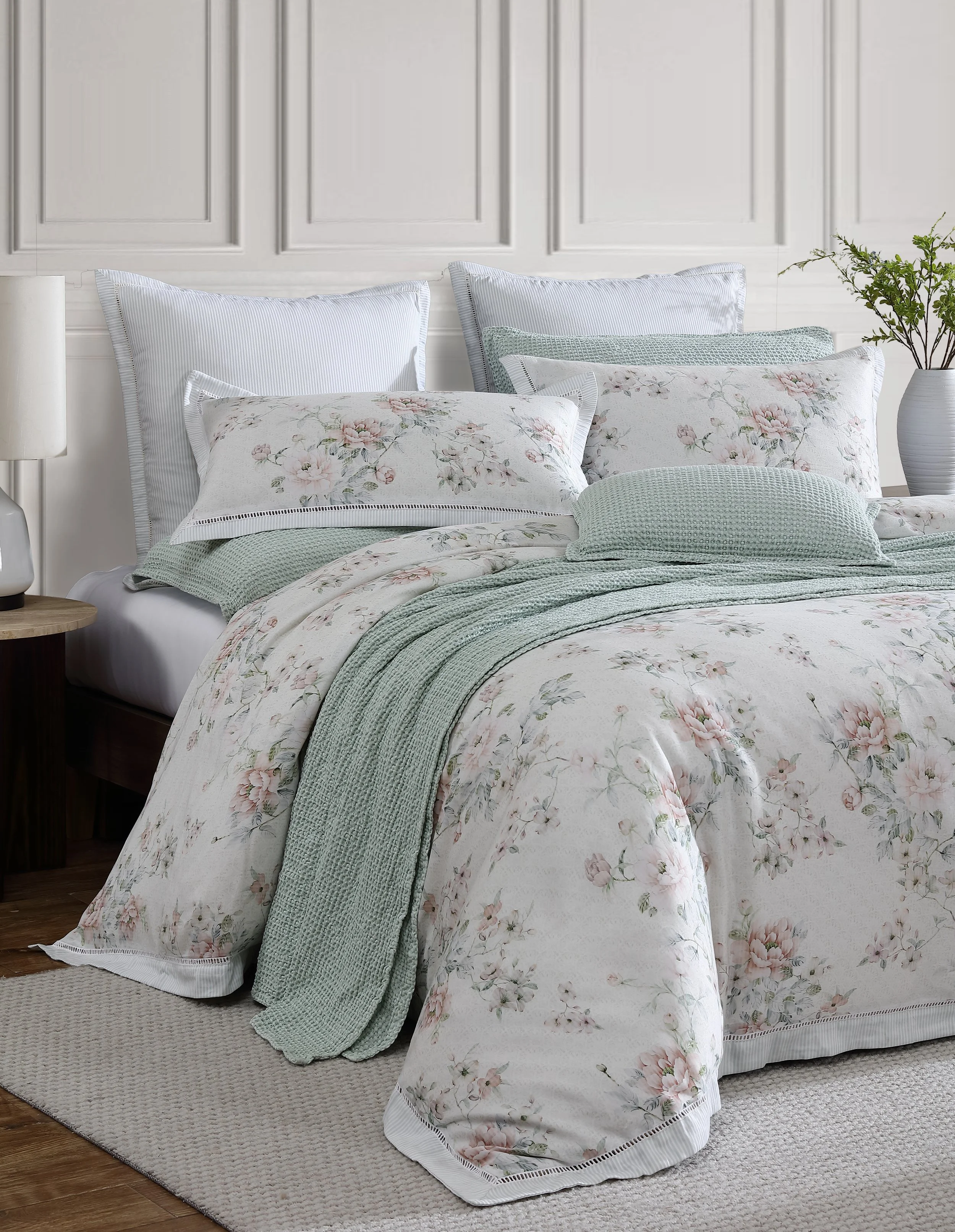 Elevate your bedroom with the timeless elegance of the Liyana Frost Quilt Cover Set. Featuring a delicate floral print, these hand-painted watercolour blooms bring a touch of nature's beauty indoors. The soft pastel hues are perfectly balanced with a refined stripe border and an inset classic ladder style lace, adding a sophisticated frame to the overall design. Designed for both comfort and style, Lyana is an ideal addition to transform any space to a serene sleep sanctuary