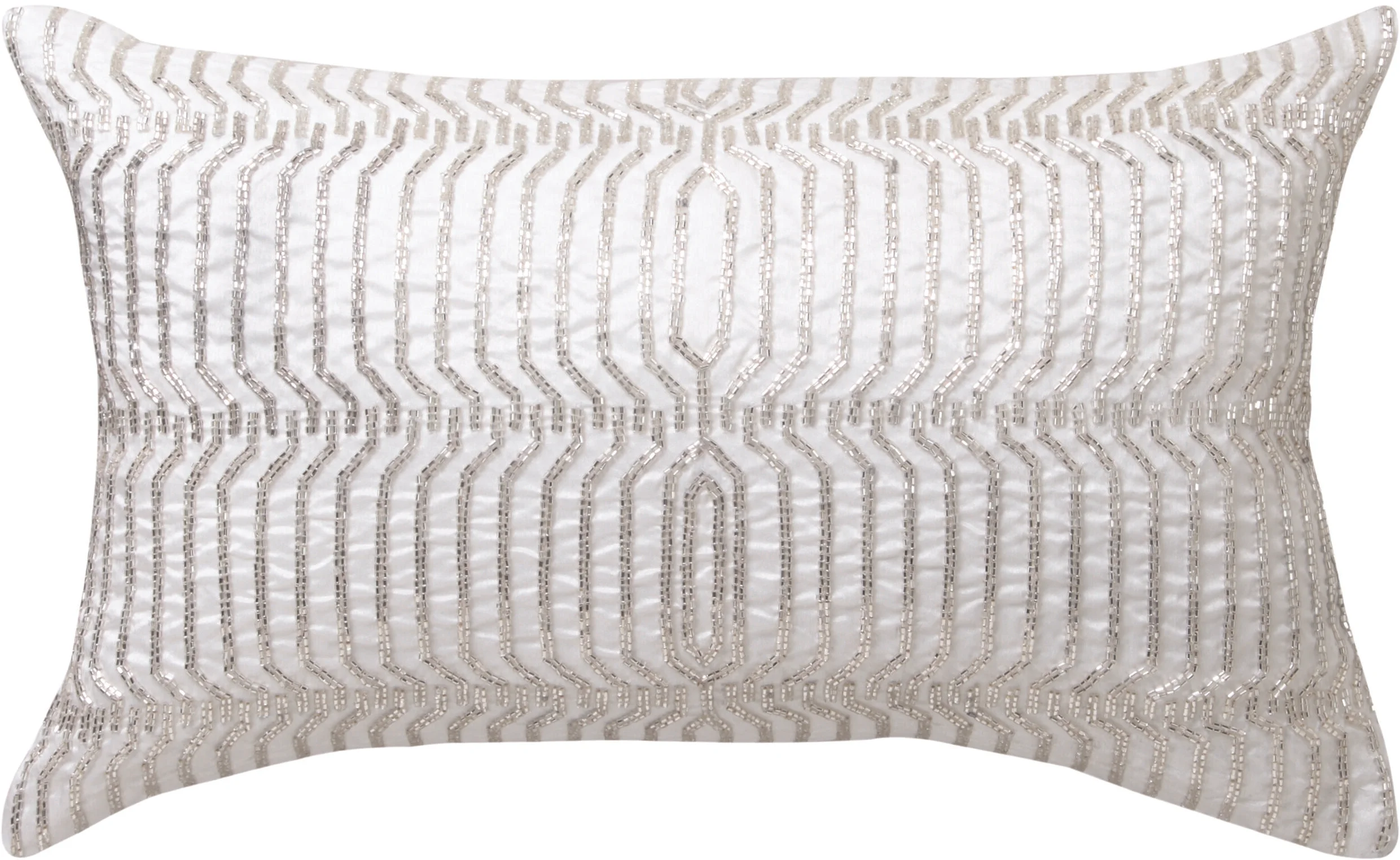 Aragon Silver decorator cushion takes inspiration from the symmetry and glamour of Art Deco. A balanced arrangement of silver beads over a white dupion base adds a chic accent to your styling.