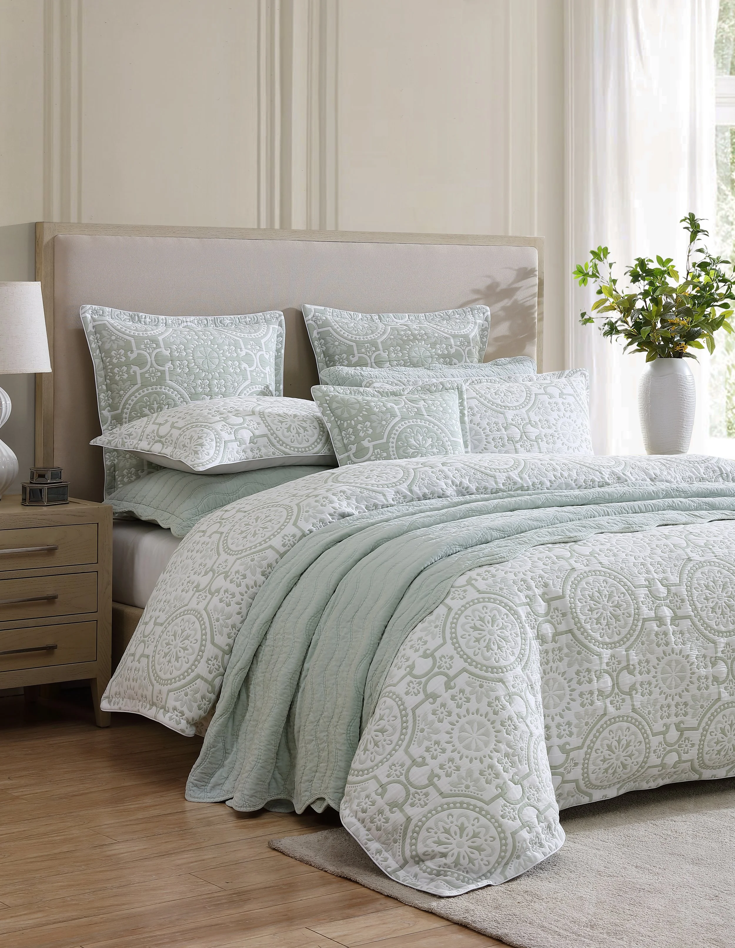 Revitalizing Private Collections favoured design Mayfair, in soft and refreshing colours for Spring and Summer. A plain white ground features a decorative array of 'folk art' style motifs in tonal shades of Sage and Stone. The cover is luxuriously quilted for downy-soft texture and easily converts to a coverlet by simply removing the inner quilt.