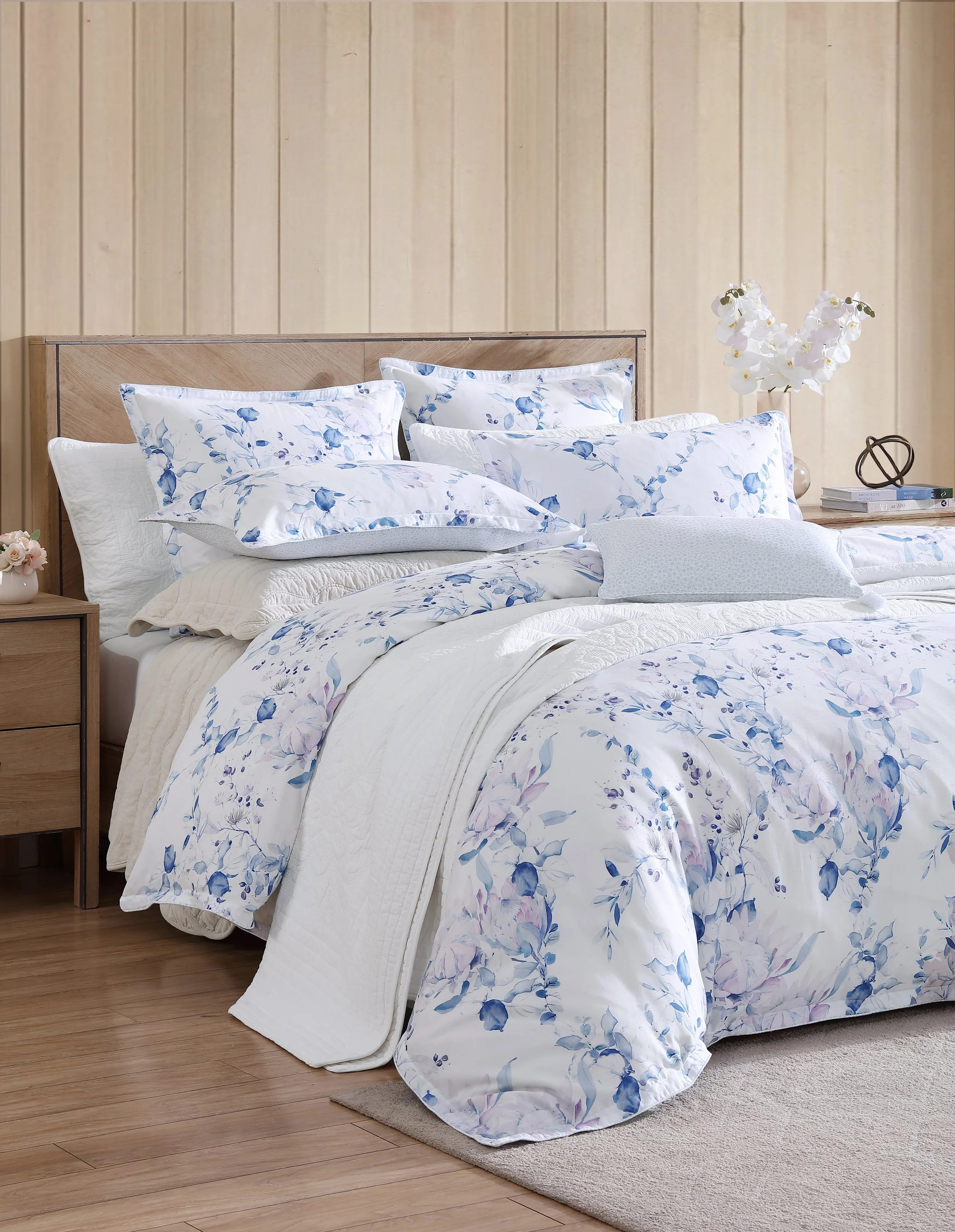 Introducing the "Millicent" Quilt Cover Set – a captivating ensemble featuring watercolour flora and fauna in soft blues and indigo tones, creating a beautiful all-over print. The reverse side boasts a charming silhouette print on a white base with a touch of chambray blue colour, offering a versatile and elegant option for a serene bedroom retreat.