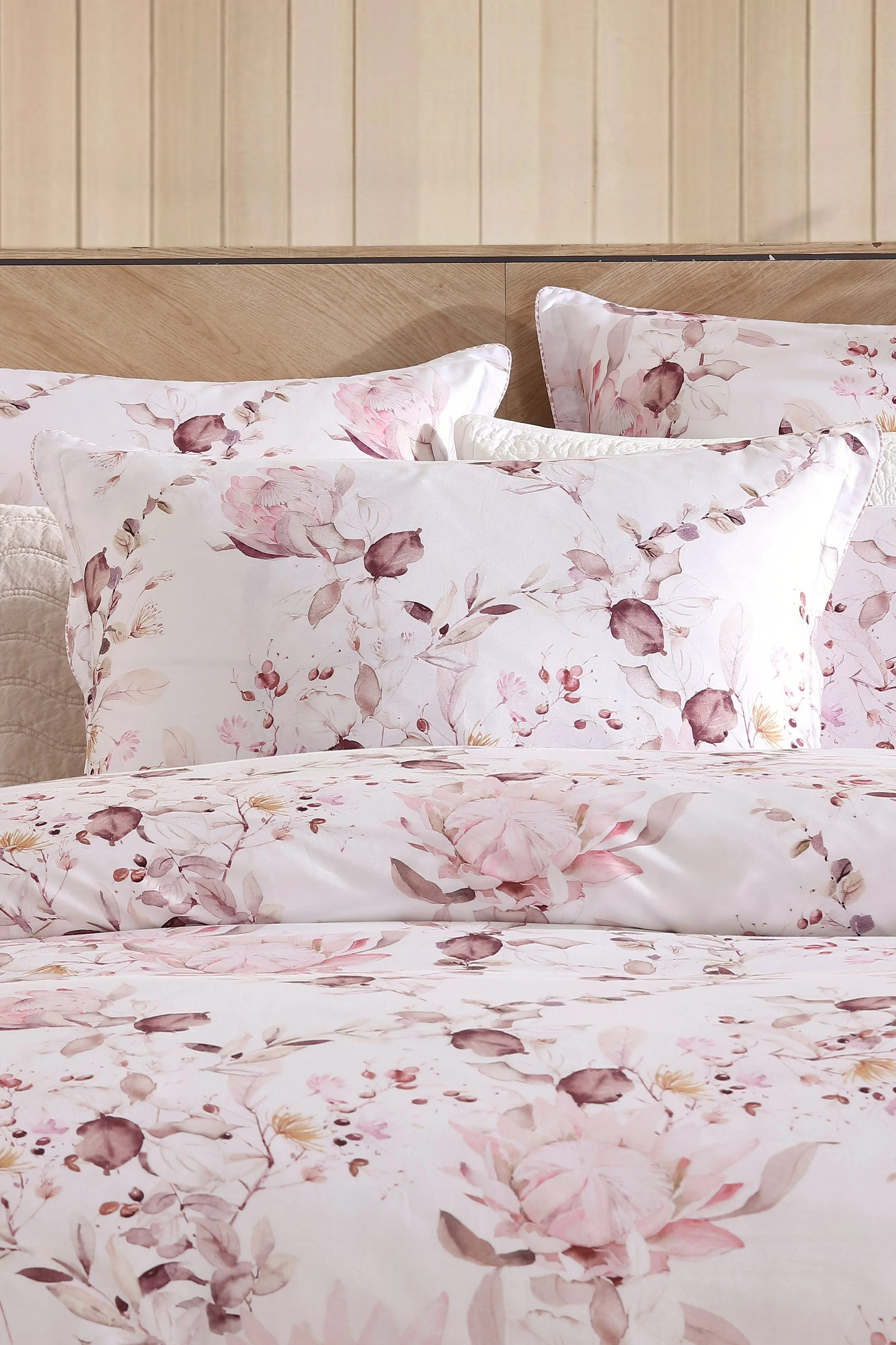 Introducing the "Millicent" Quilt Cover Set – a captivating ensemble featuring watercolour flora and fauna in soft pinks and earthy tones, creating a beautiful all-over print. The reverse side boasts a charming silhouette print on a white base with a touch of rose colour, offering a versatile and elegant option for a serene bedroom retreat.