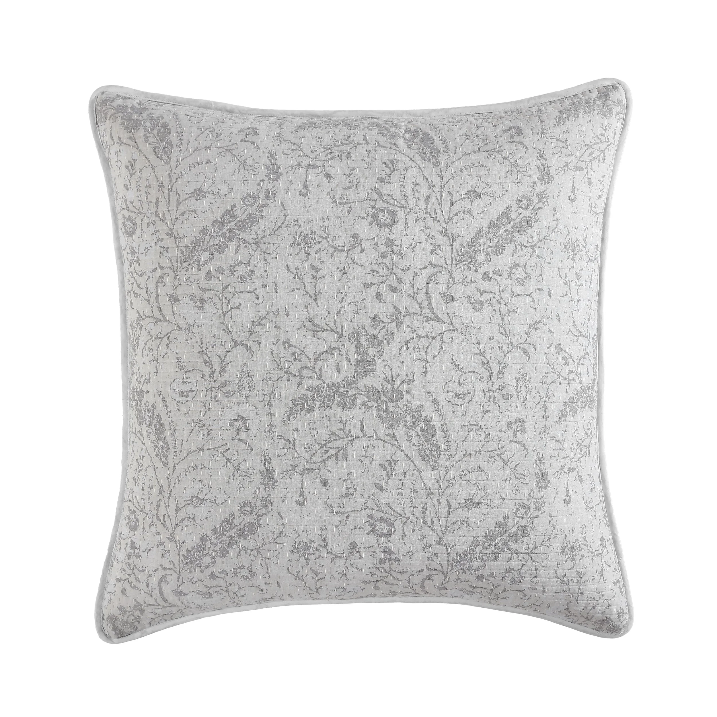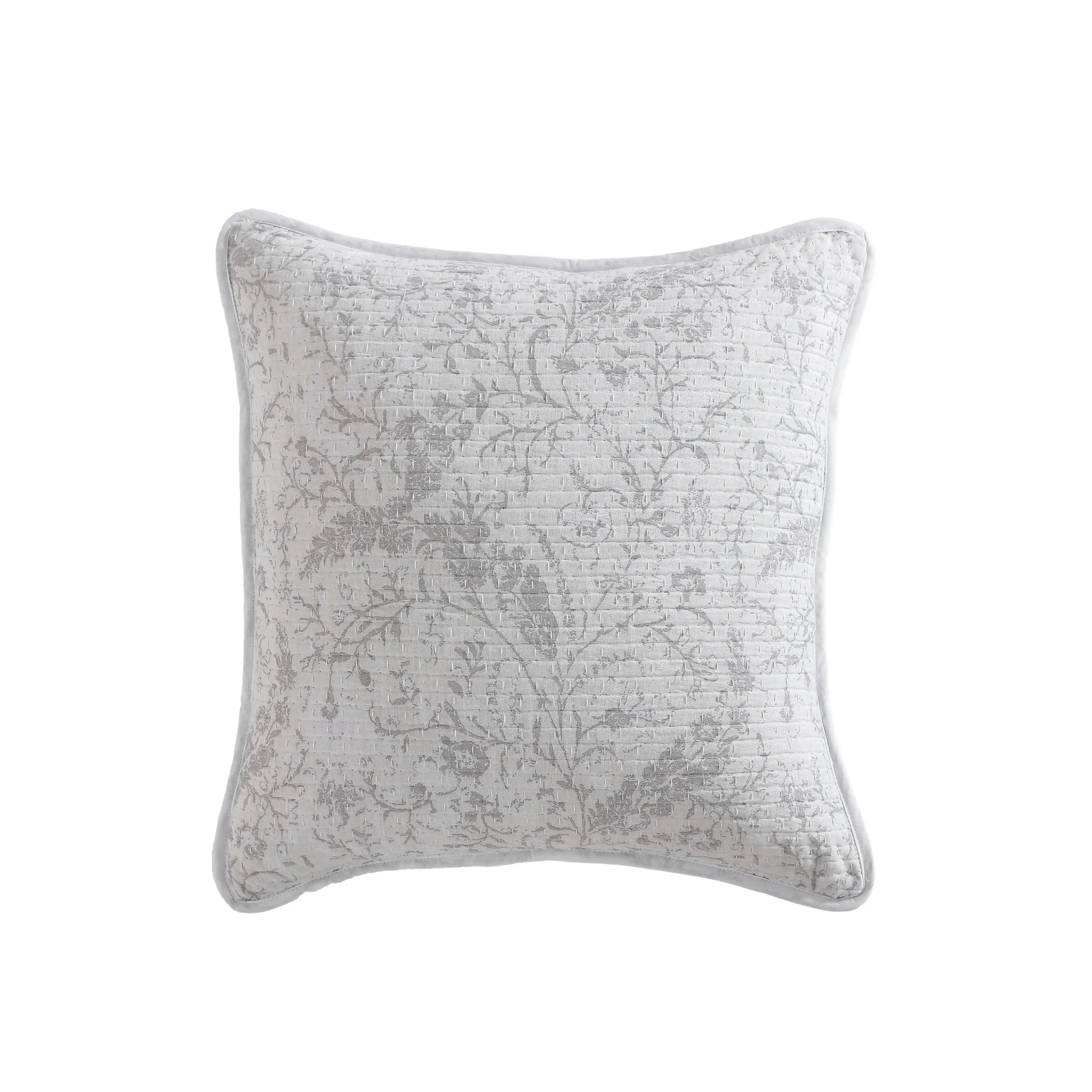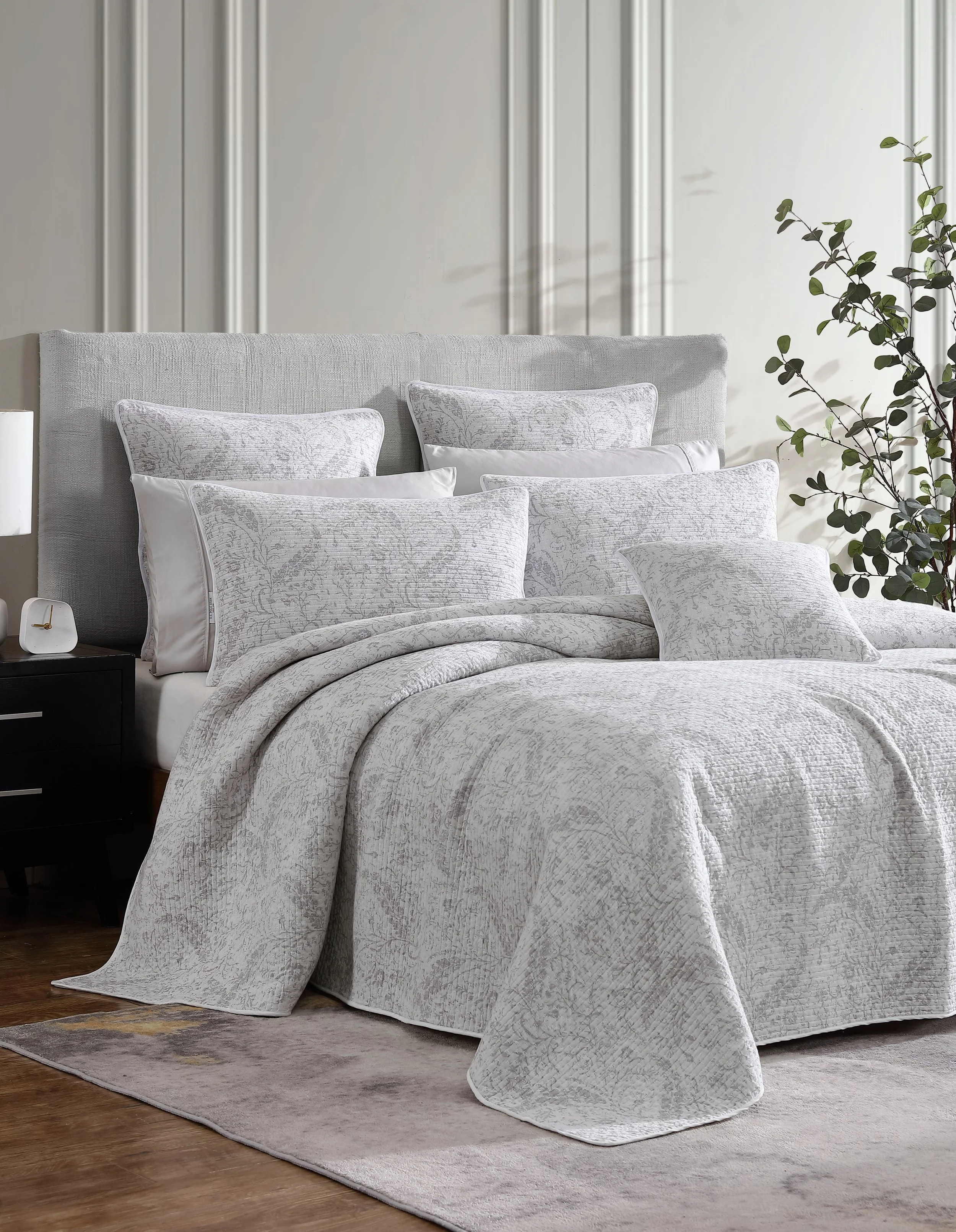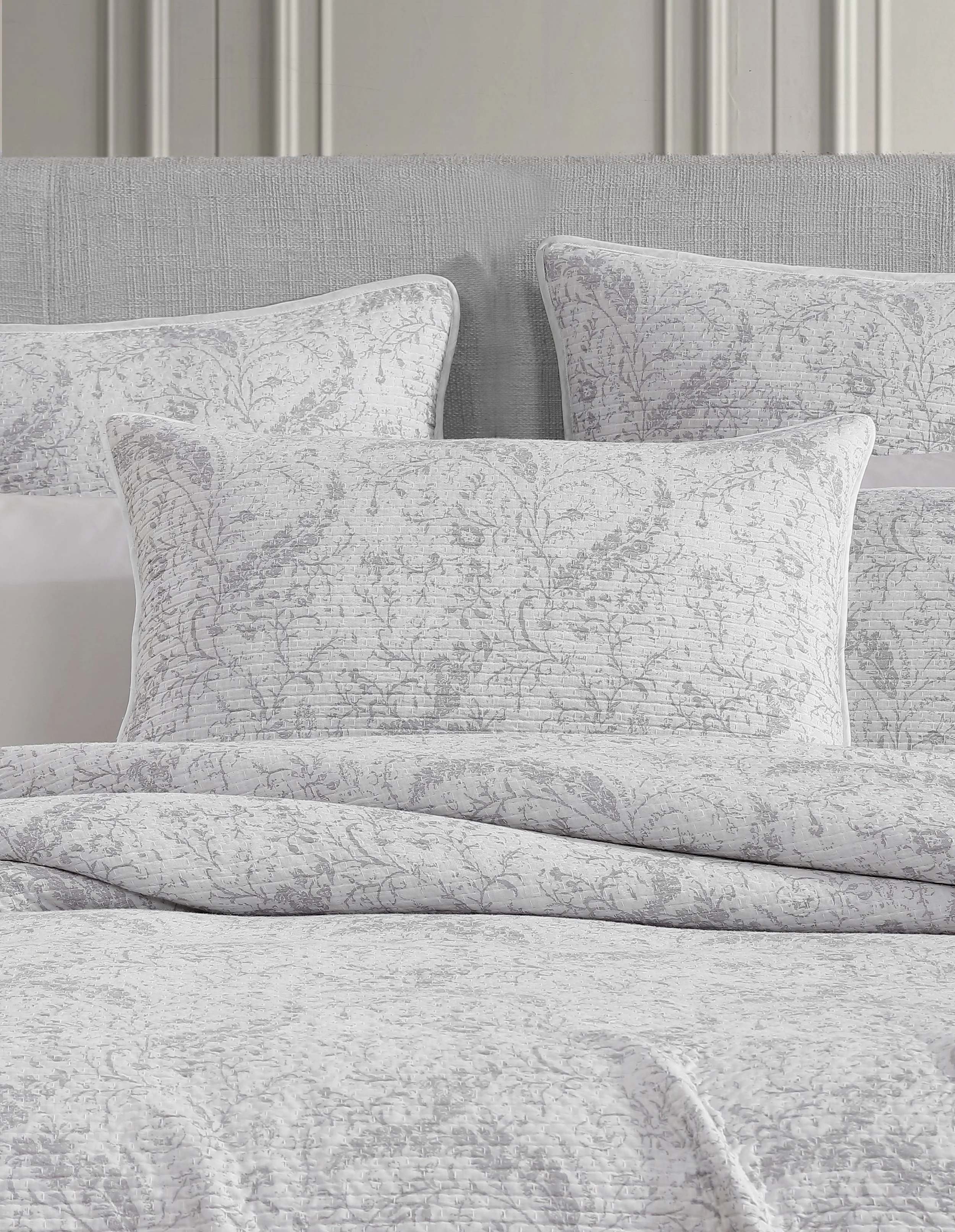 Wren, a coverlet that is an exquisite blend of woven delicate foliage with printed stencil-like texture in soft shades of grey against a subtle ivory background. The quilted coverlet adds depth, creating an elegant and sophisticated touch to your bedding ensemble. Finished with a classic bound edge, Wren will elevate your bedroom as a timeless piece